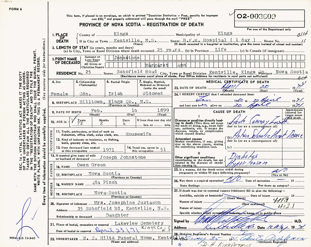 PROVINCE OF NOVA SCOTIA — REGISTRATION OF DEATH