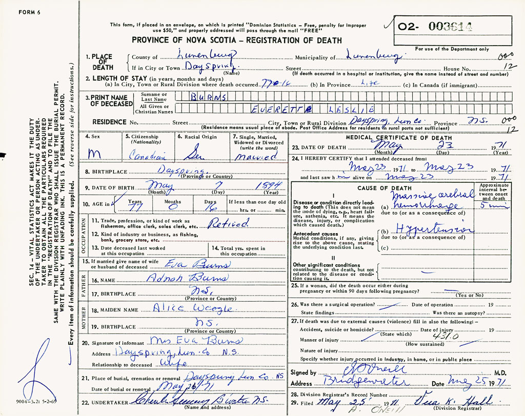 PROVINCE OF NOVA SCOTIA — REGISTRATION OF DEATH