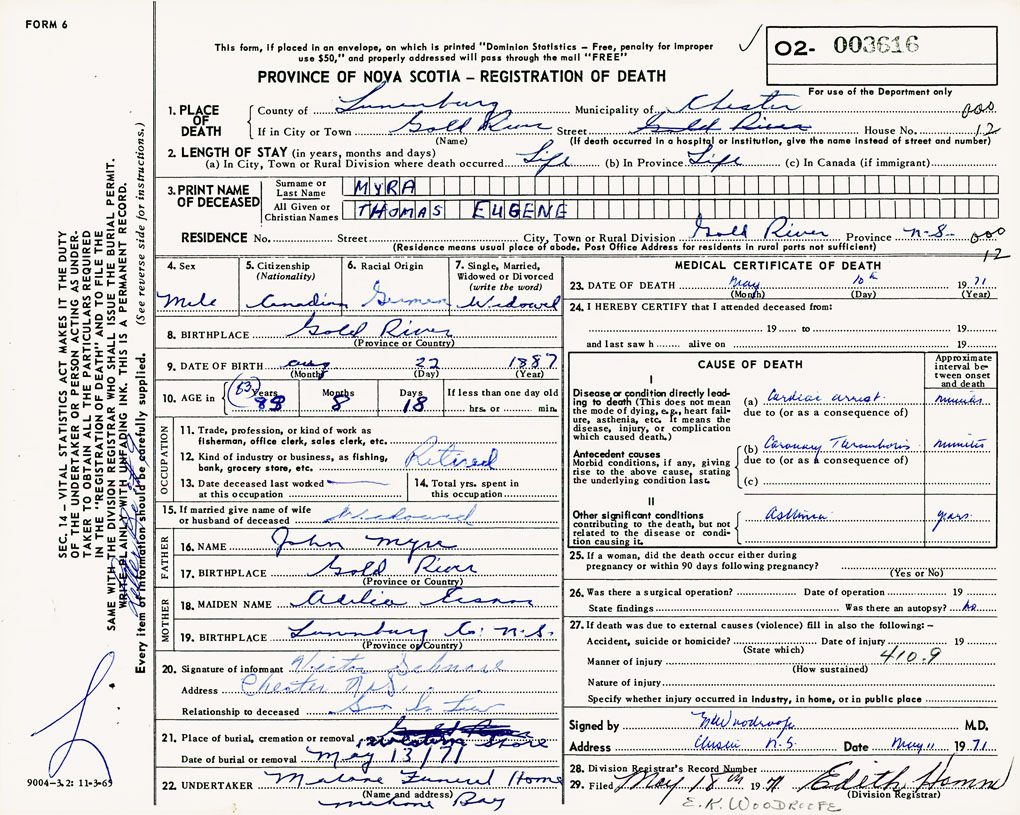 PROVINCE OF NOVA SCOTIA — REGISTRATION OF DEATH