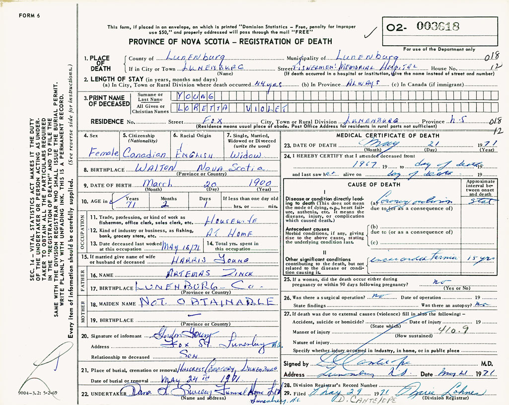 21. Place of burial Hillcrest Cemetery, Lunenburg, NS