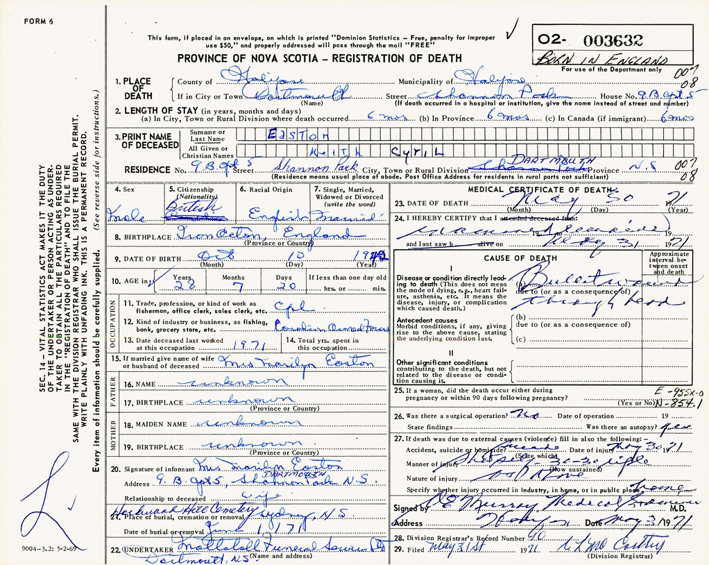 PROVINCE OF NOVA SCOTIA — REGISTRATION OF DEATH