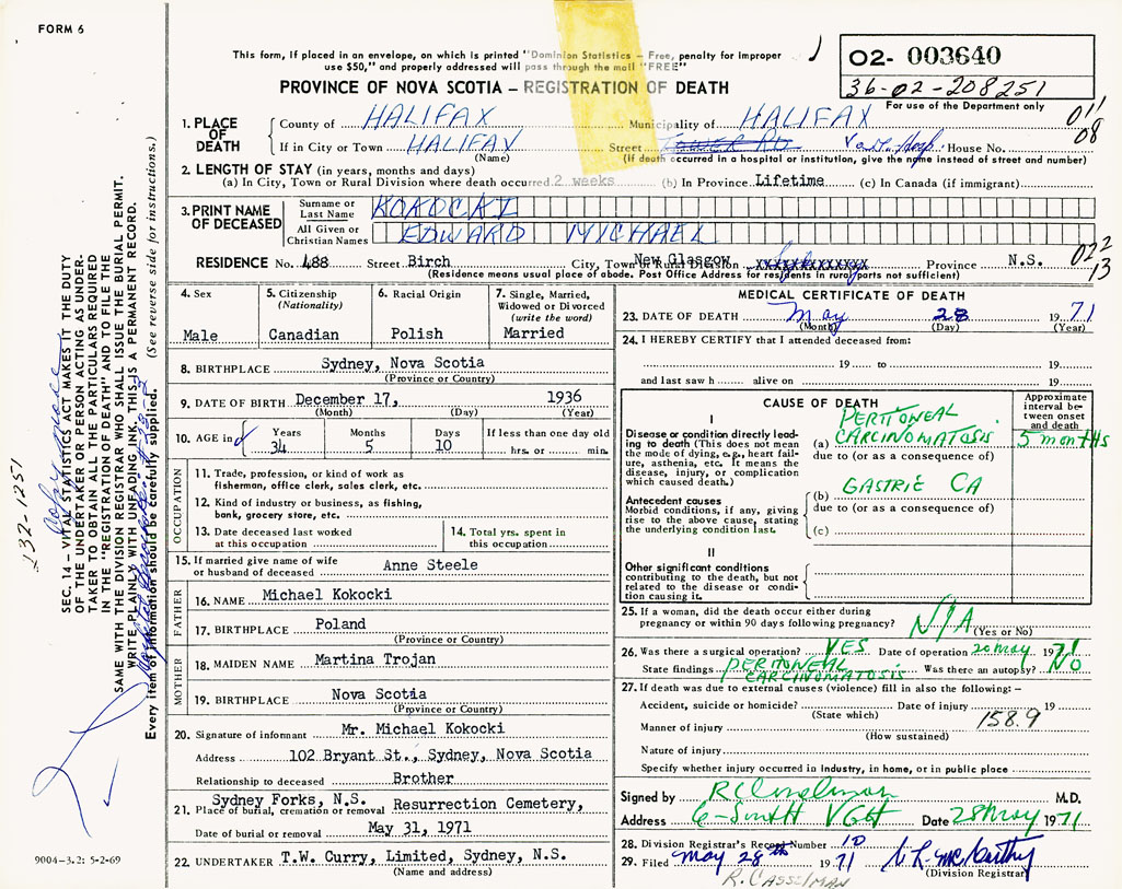 PROVINCE OF NOVA SCOTIA — REGISTRATION OF DEATH