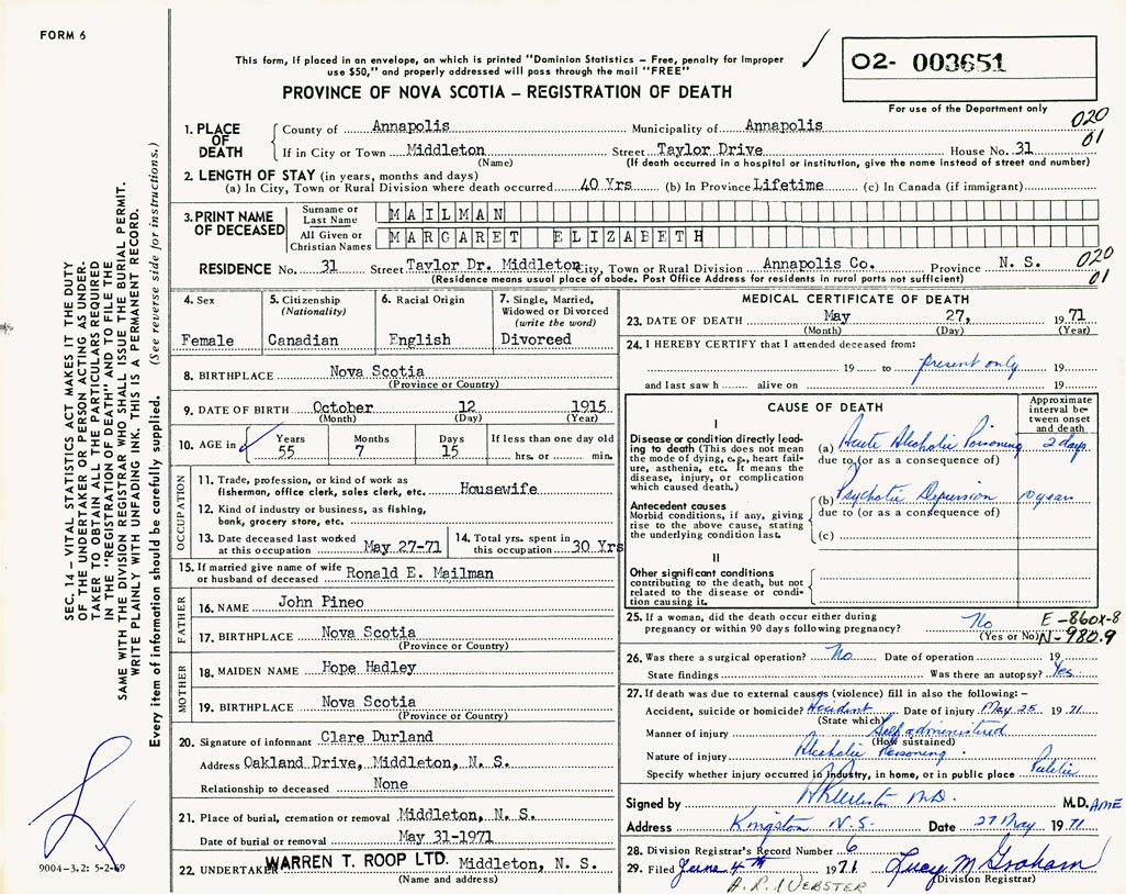 PROVINCE OF NOVA SCOTIA — REGISTRATION OF DEATH