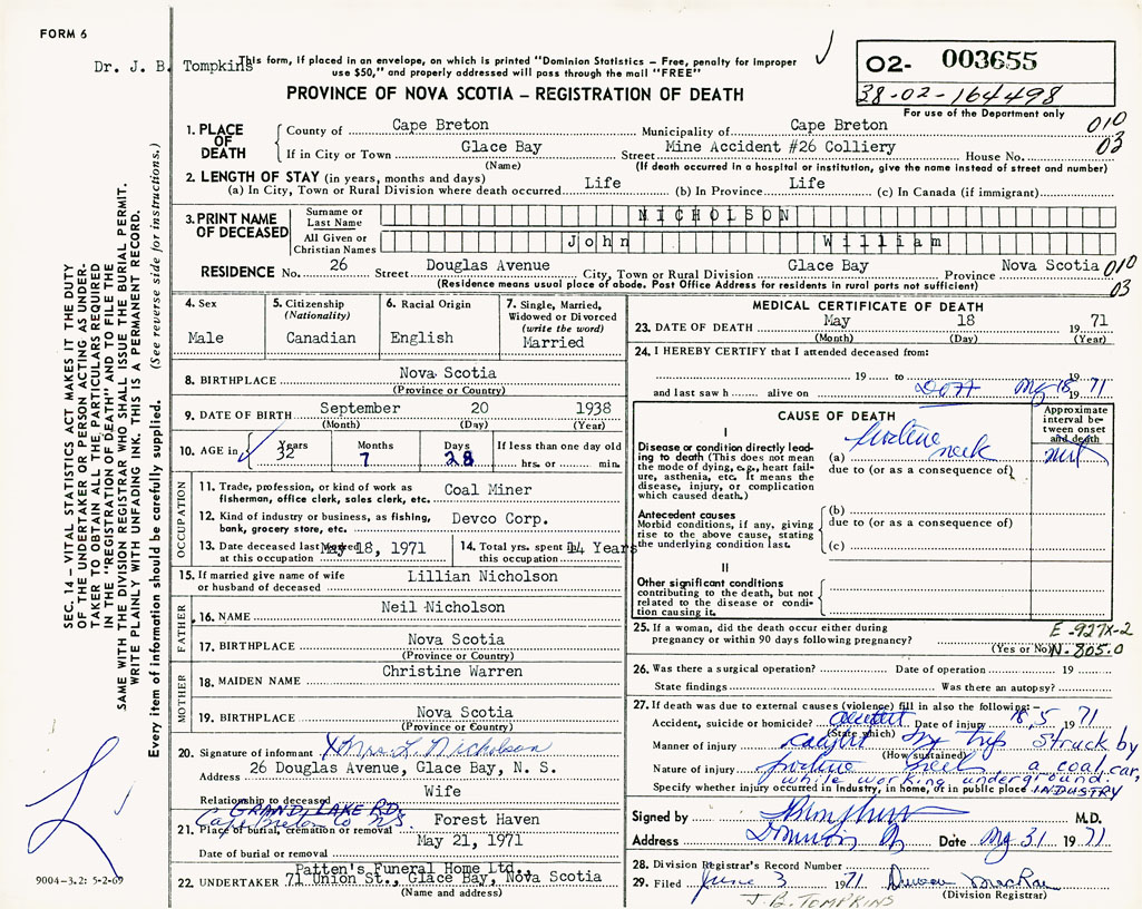 PROVINCE OF NOVA SCOTIA — REGISTRATION OF DEATH