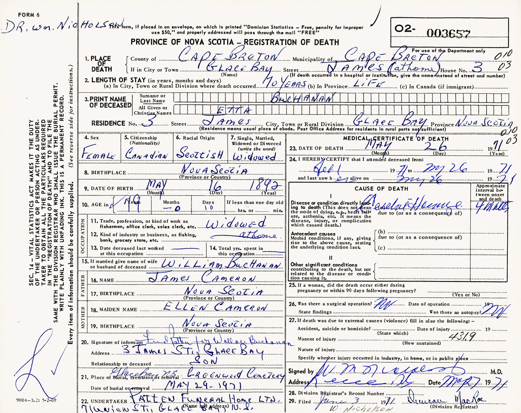 PROVINCE OF NOVA SCOTIA — REGISTRATION OF DEATH