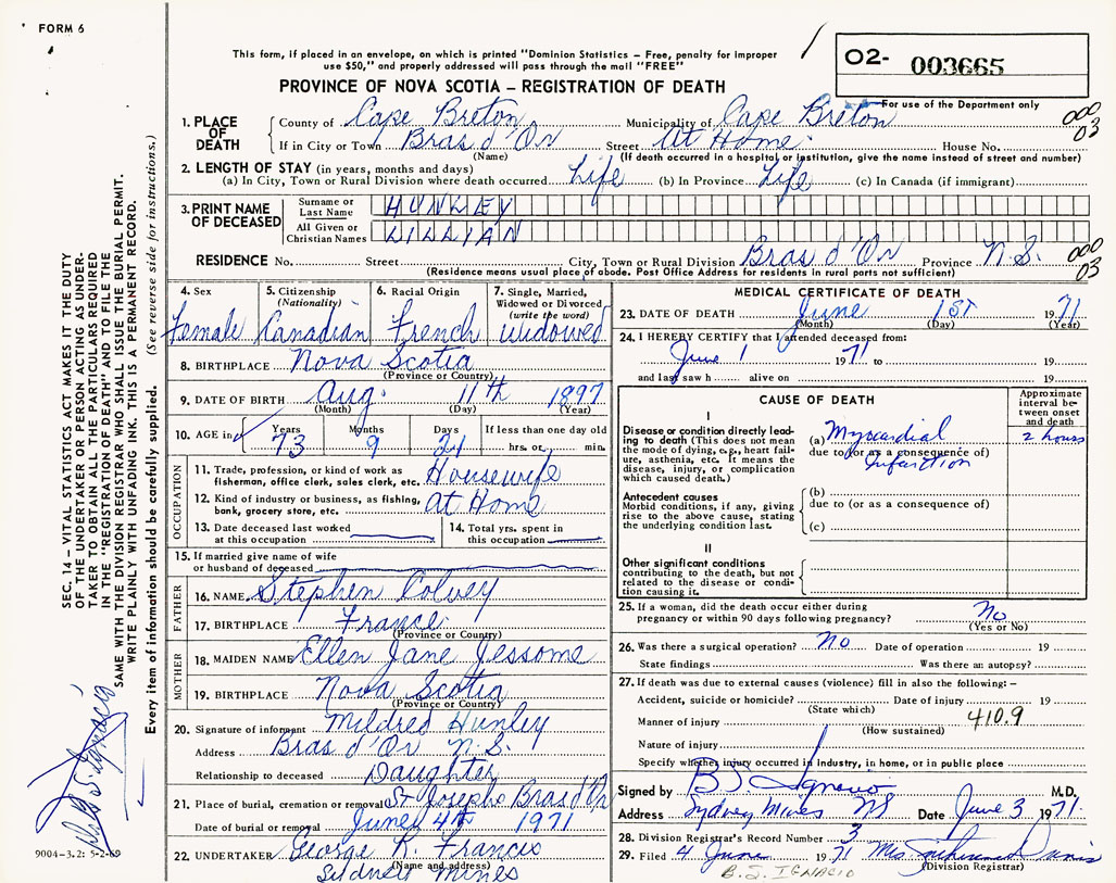 1. PLACE OF DEATH County of Cape Breton If in City or Town Bras d'Or