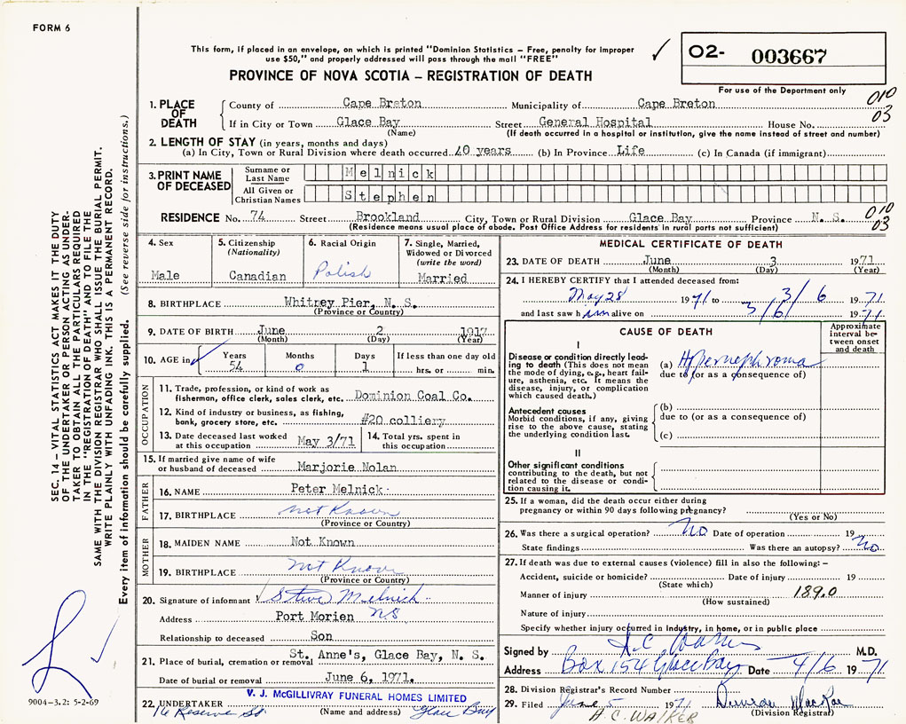 1. PLACE OF DEATH County of Cape Breton If in City or Town Glace Bay