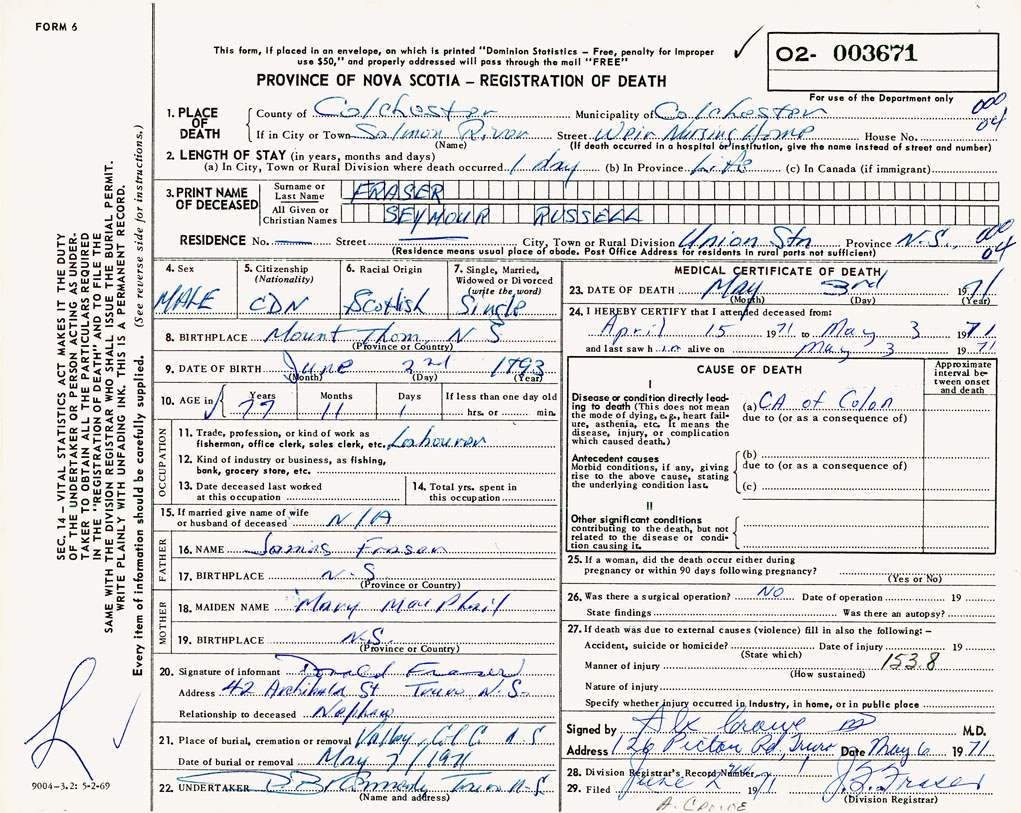 PROVINCE OF NOVA SCOTIA — REGISTRATION OF DEATH