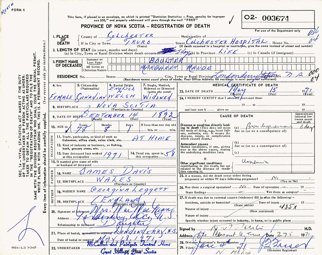 PROVINCE OF NOVA SCOTIA — REGISTRATION OF DEATH
