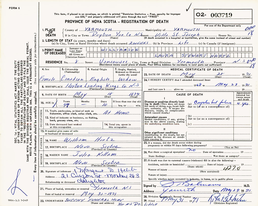 PROVINCE OF NOVA SCOTIA — REGISTRATION OF DEATH