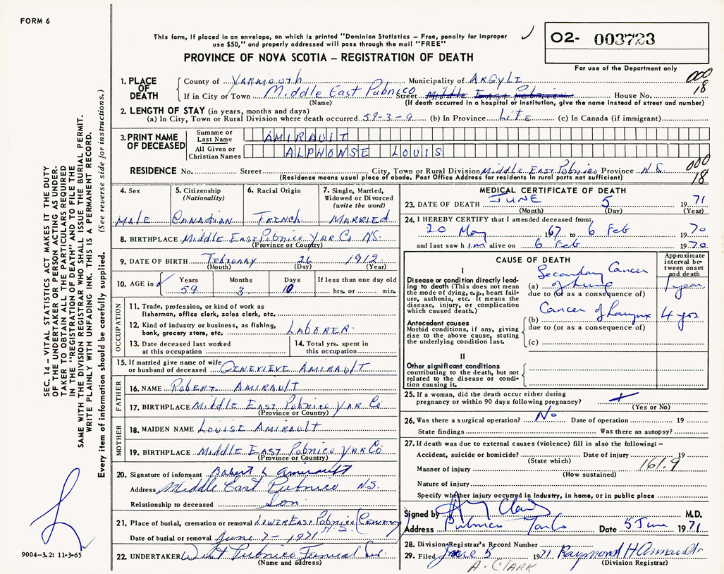 1. PLACE OF DEATH County of Yarmouth If in City or Town Middle East Pubnico