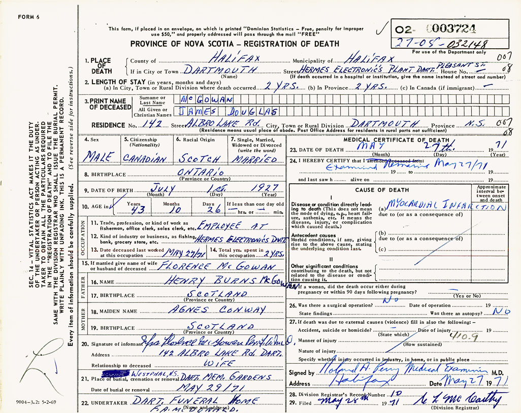 PROVINCE OF NOVA SCOTIA — REGISTRATION OF DEATH