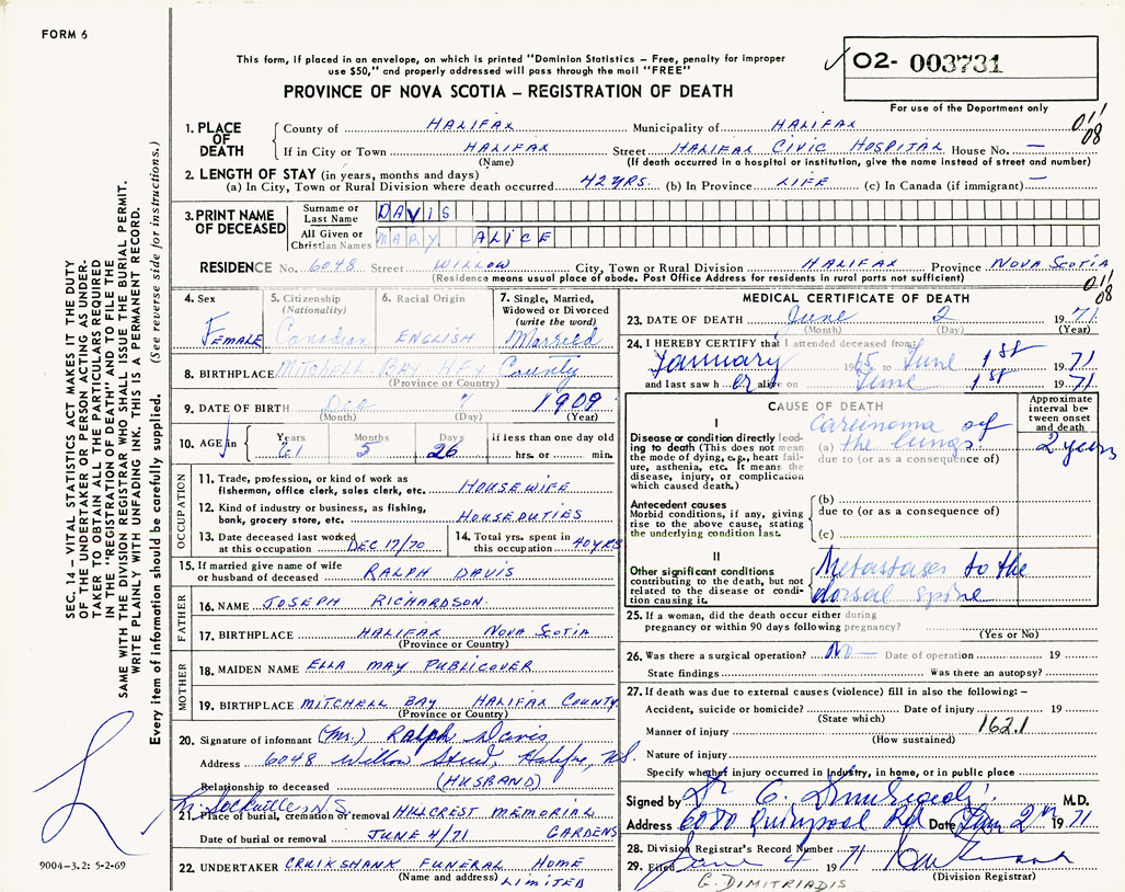PROVINCE OF NOVA SCOTIA — REGISTRATION OF DEATH