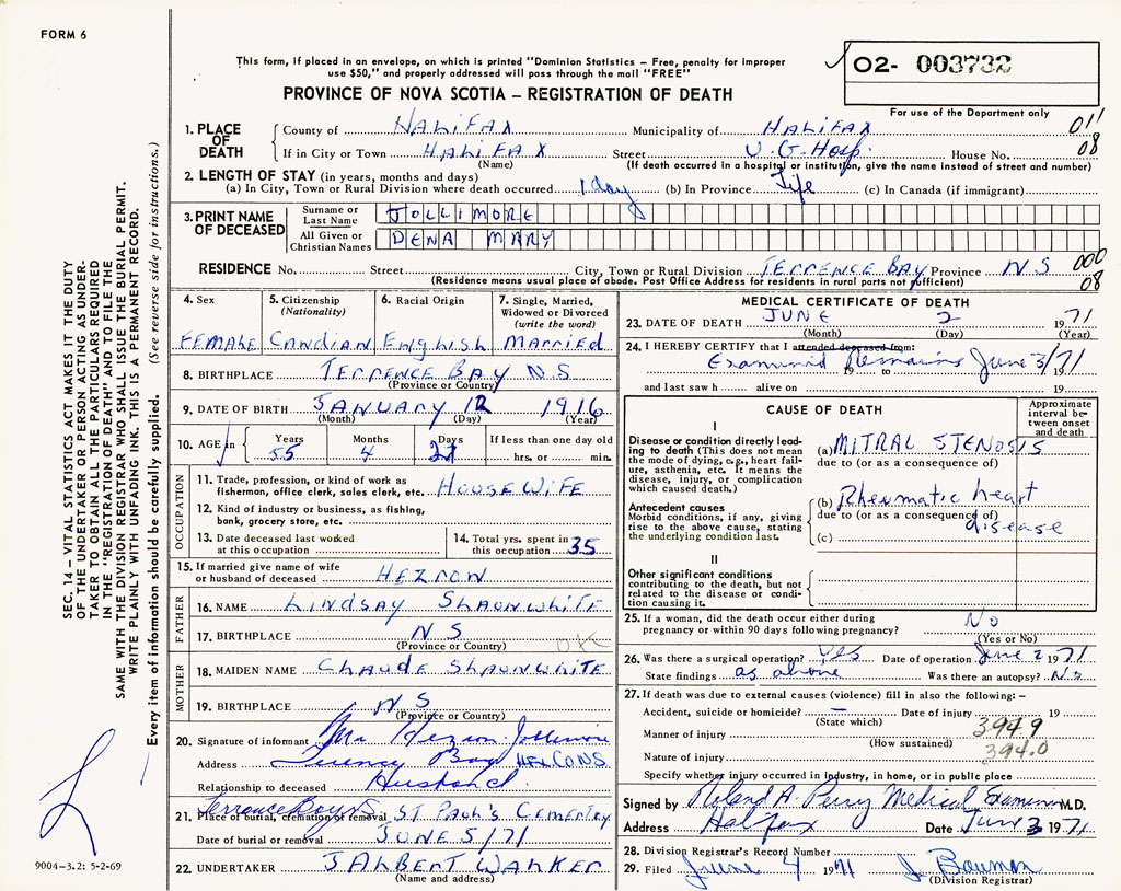 PROVINCE OF NOVA SCOTIA — REGISTRATION OF DEATH