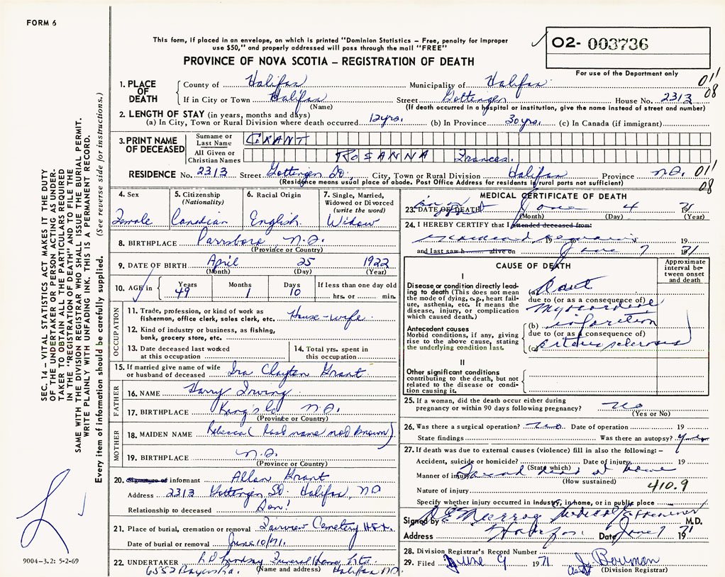 PROVINCE OF NOVA SCOTIA — REGISTRATION OF DEATH