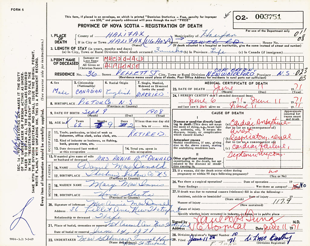 PROVINCE OF NOVA SCOTIA — REGISTRATION OF DEATH