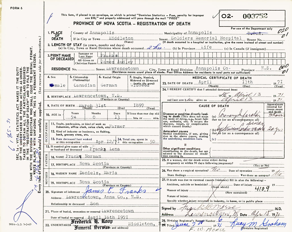 PROVINCE OF NOVA SCOTIA — REGISTRATION OF DEATH