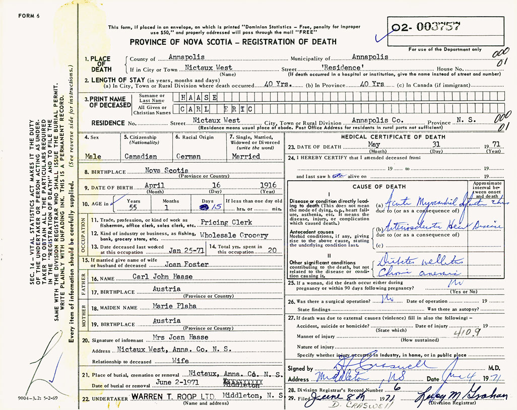 PROVINCE OF NOVA SCOTIA — REGISTRATION OF DEATH