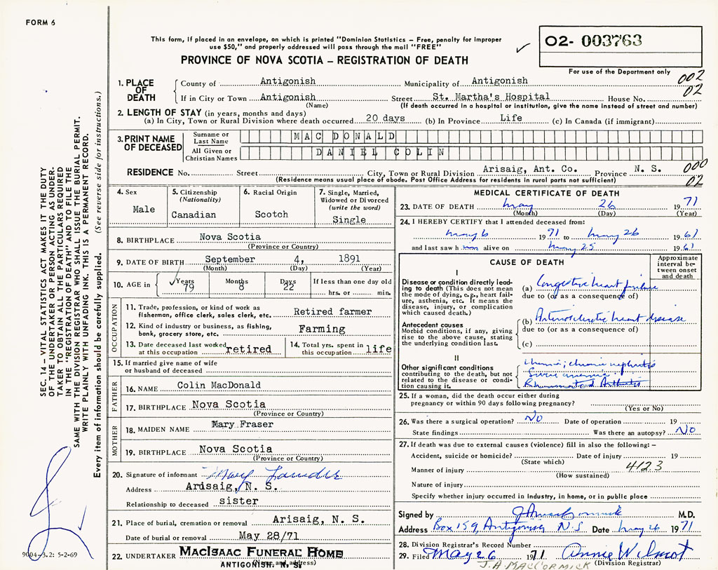 PROVINCE OF NOVA SCOTIA — REGISTRATION OF DEATH