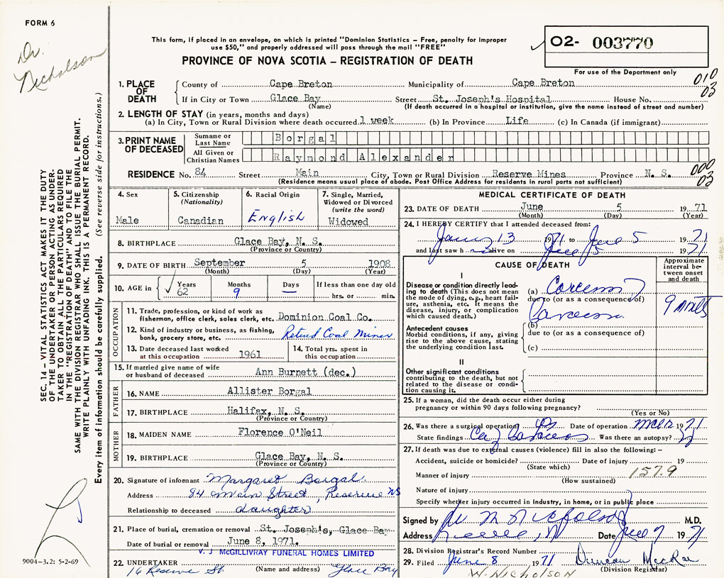 1. PLACE OF DEATH County of Cape Breton If in City or Town Glace Bay