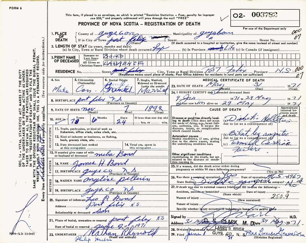 1. PLACE OF DEATH County of Guysborough If in City or Town Port Felix