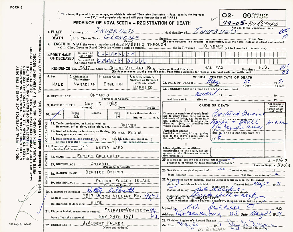 PROVINCE OF NOVA SCOTIA — REGISTRATION OF DEATH