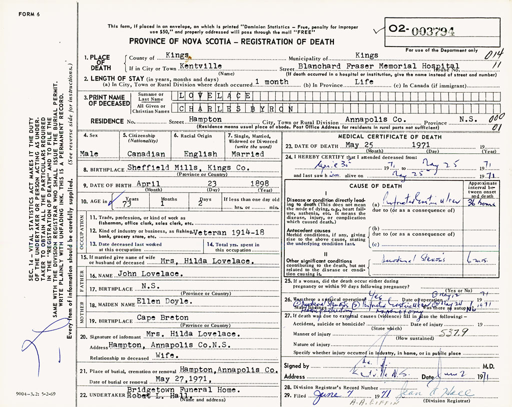 PROVINCE OF NOVA SCOTIA — REGISTRATION OF DEATH