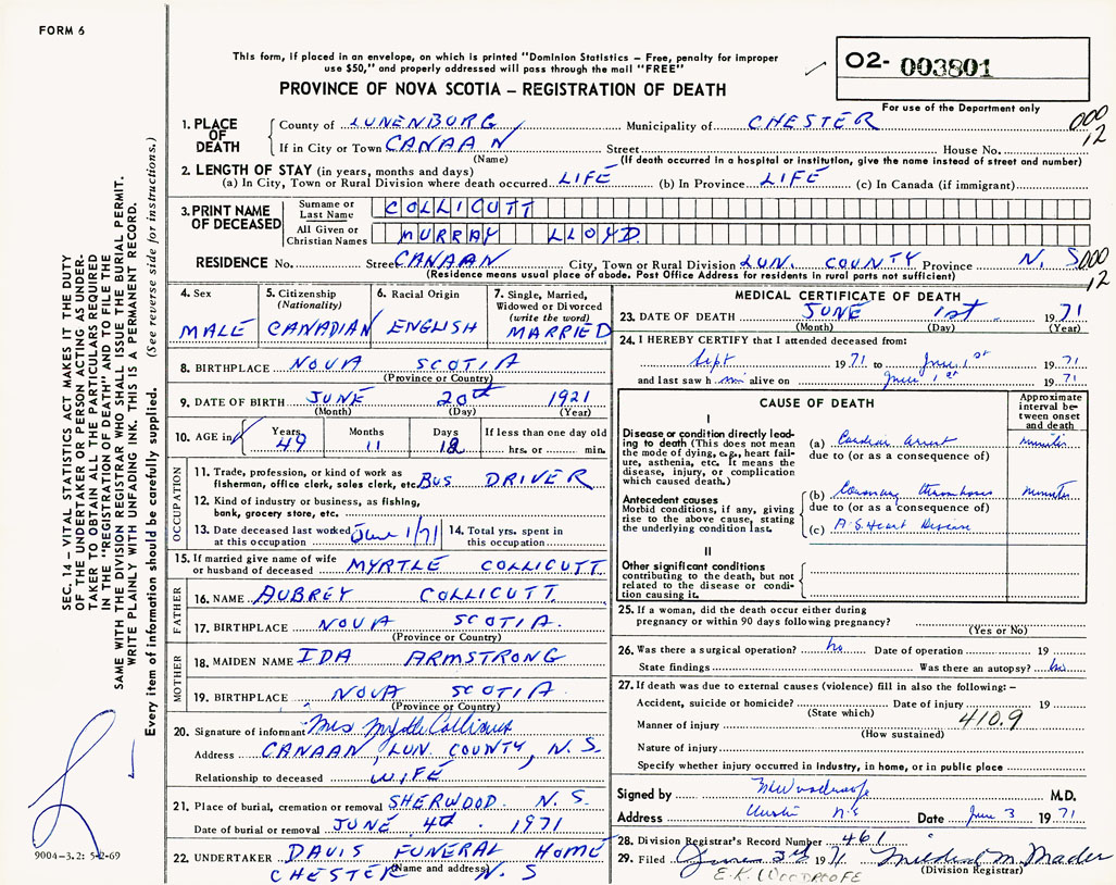 PROVINCE OF NOVA SCOTIA — REGISTRATION OF DEATH