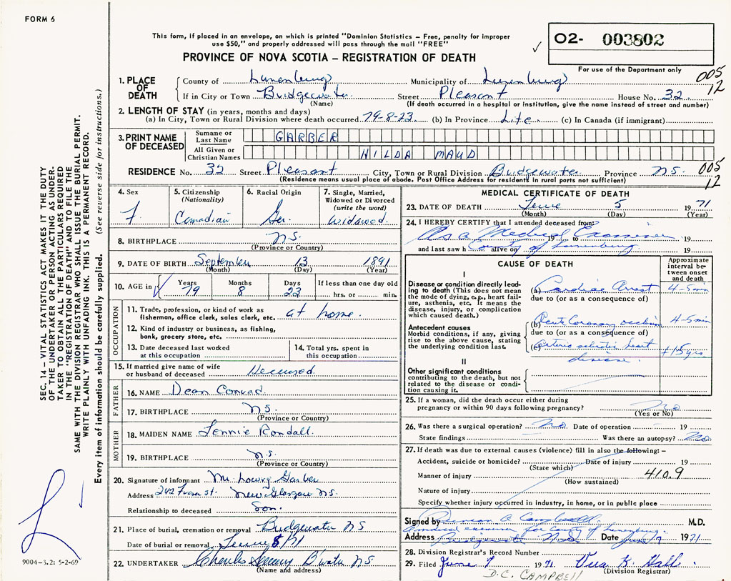 PROVINCE OF NOVA SCOTIA — REGISTRATION OF DEATH