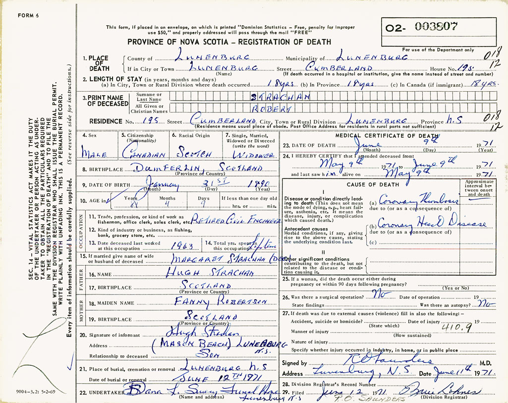 PROVINCE OF NOVA SCOTIA — REGISTRATION OF DEATH
