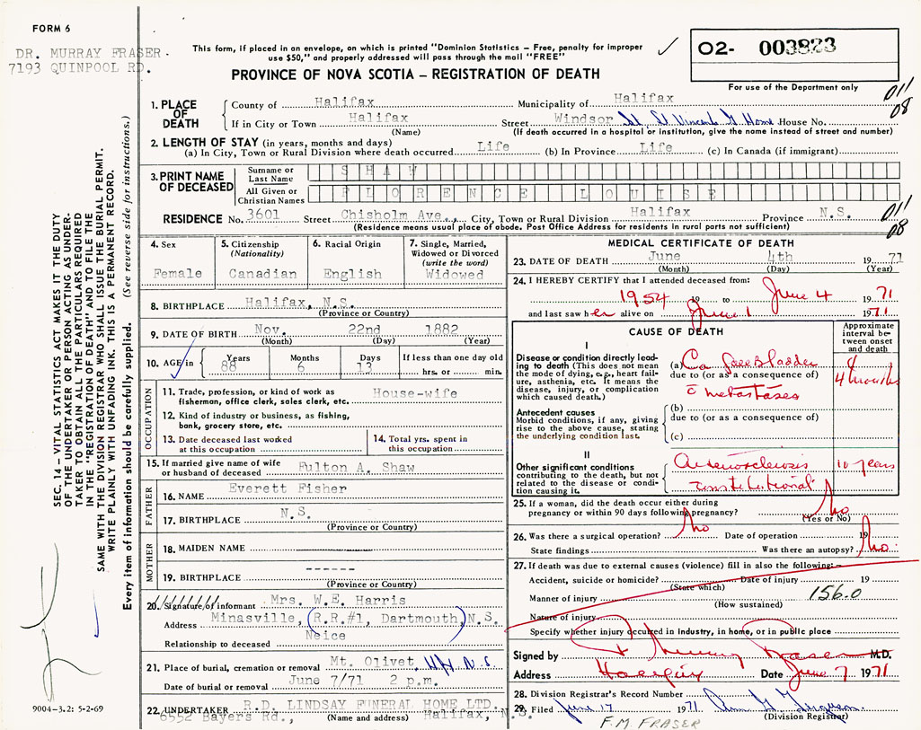 PROVINCE OF NOVA SCOTIA — REGISTRATION OF DEATH