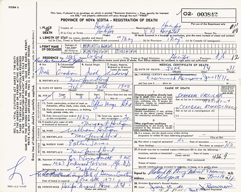 PROVINCE OF NOVA SCOTIA — REGISTRATION OF DEATH