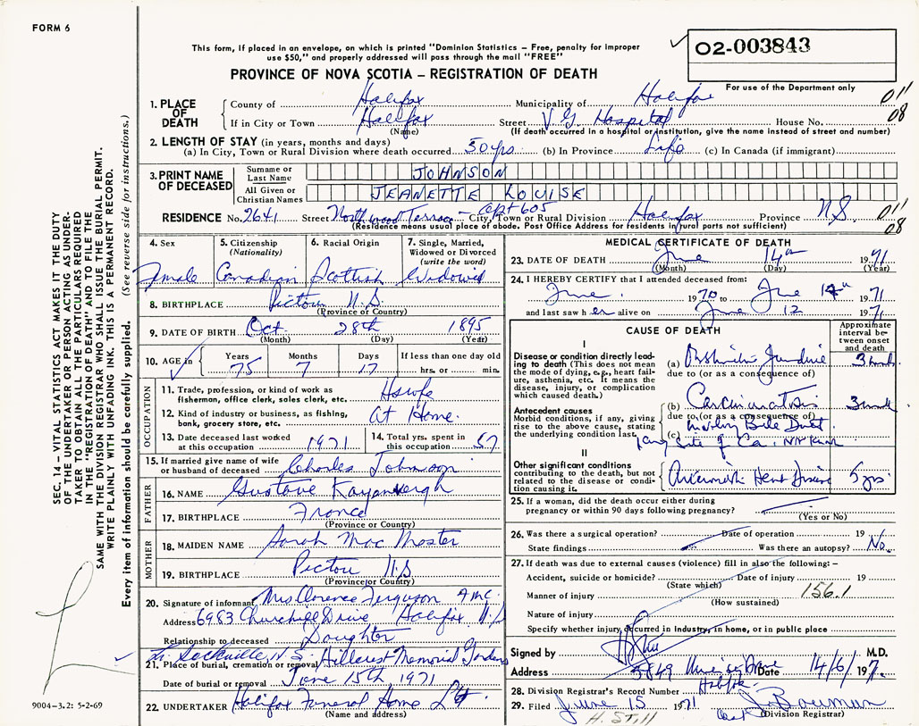 PROVINCE OF NOVA SCOTIA — REGISTRATION OF DEATH