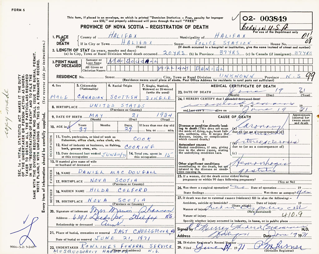 PROVINCE OF NOVA SCOTIA — REGISTRATION OF DEATH