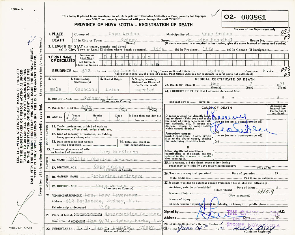 1. PLACE OF DEATH County of Cape Breton If in City or Town Sydney