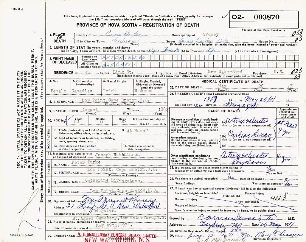 21. Place of burial St. Agnes Cemetery, New Waterford, NS