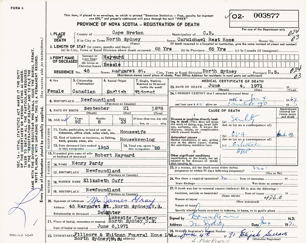 PROVINCE OF NOVA SCOTIA — REGISTRATION OF DEATH