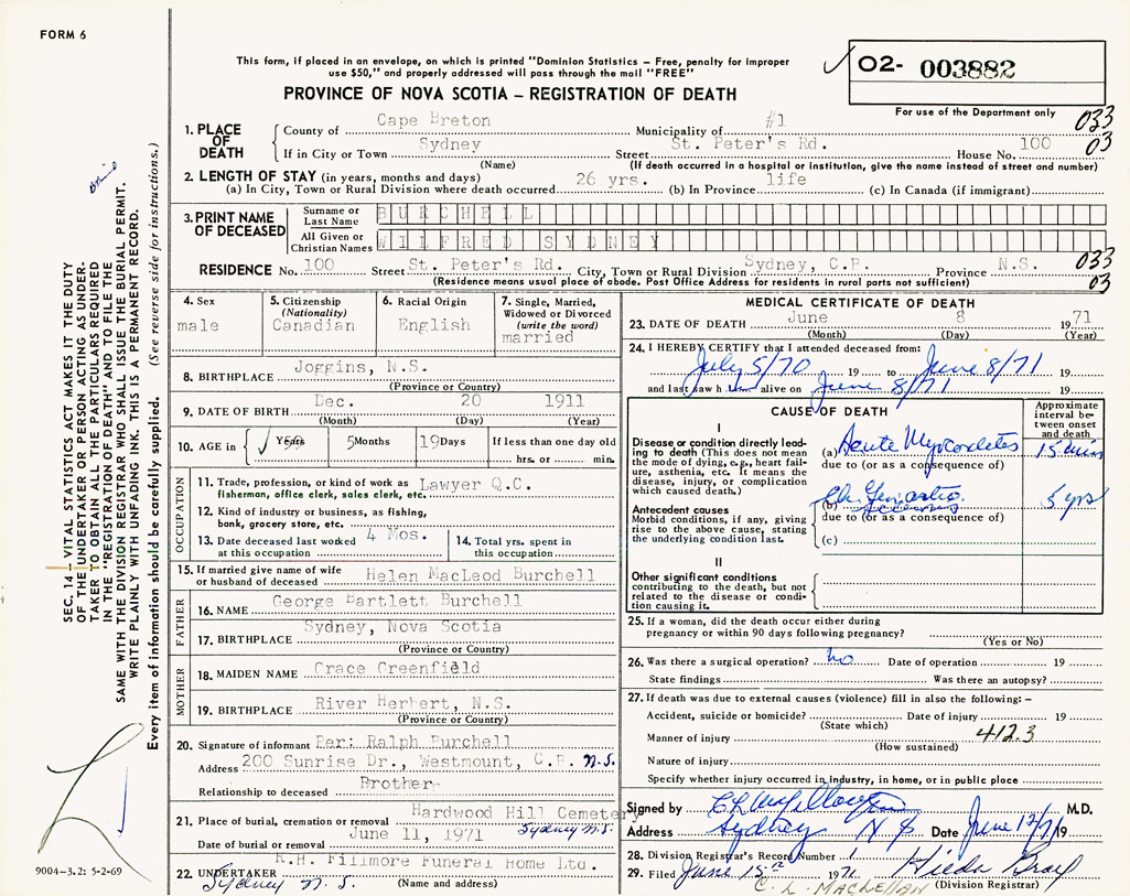 21. Place of burial Hardwood Hill Cemetery, Sydney N.S.