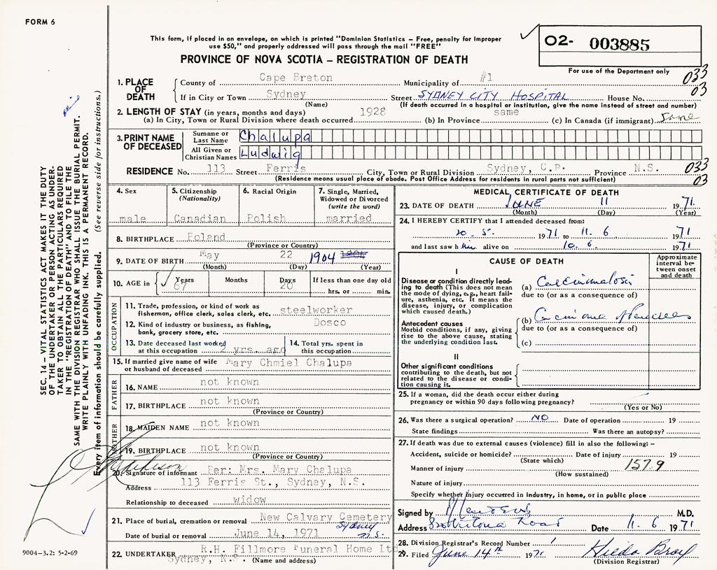 1. PLACE OF DEATH County of Cape Breton If in City or Town Sydney