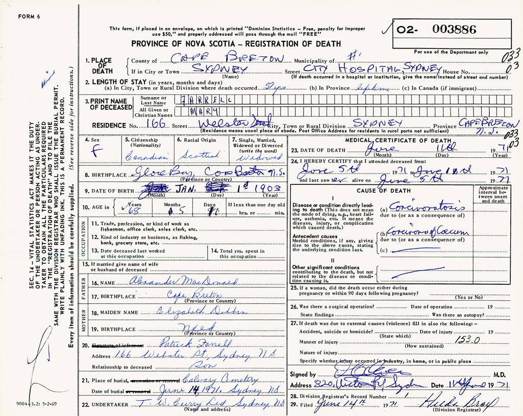 21. Place of burial Calvary Cemetery, Sydney, NS
