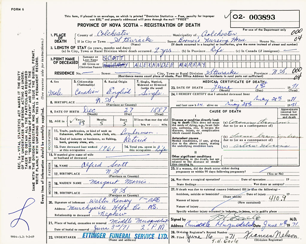 PROVINCE OF NOVA SCOTIA — REGISTRATION OF DEATH