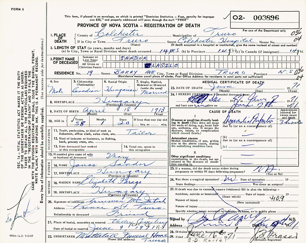 PROVINCE OF NOVA SCOTIA — REGISTRATION OF DEATH