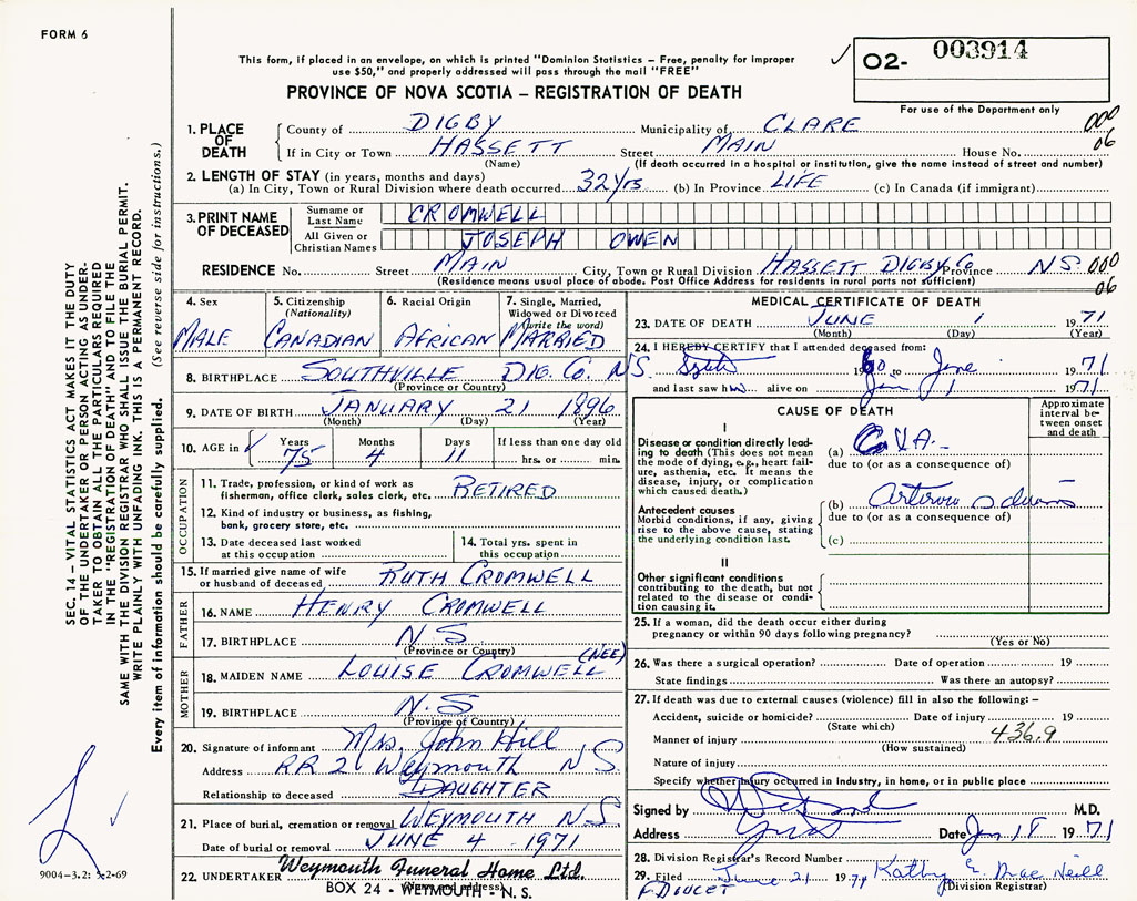PROVINCE OF NOVA SCOTIA — REGISTRATION OF DEATH