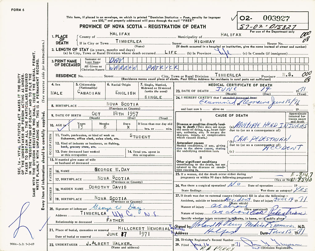 1. PLACE OF DEATH County of Halifax If in City or Town Timberlea
