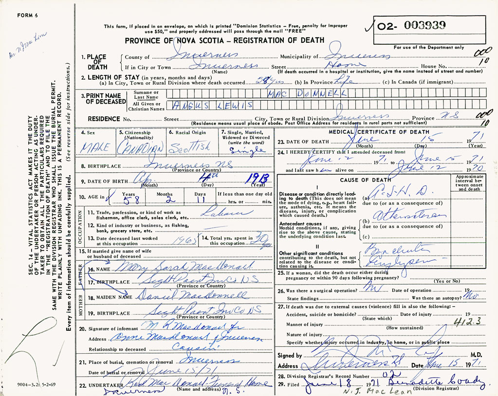 PROVINCE OF NOVA SCOTIA — REGISTRATION OF DEATH