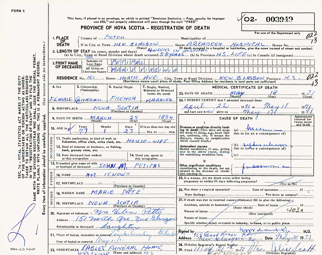 1. PLACE OF DEATH County of Pictou If in City or Town New Glasgow