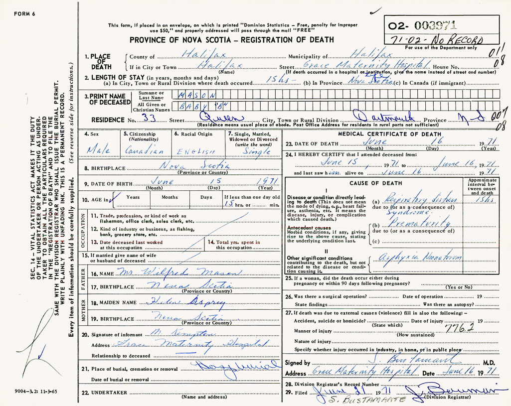 PROVINCE OF NOVA SCOTIA — REGISTRATION OF DEATH