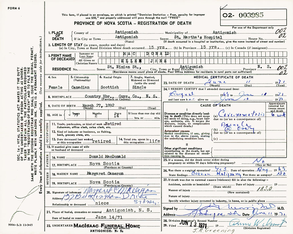 1. PLACE OF DEATH County of Antigonish If in City or Town Antigonish