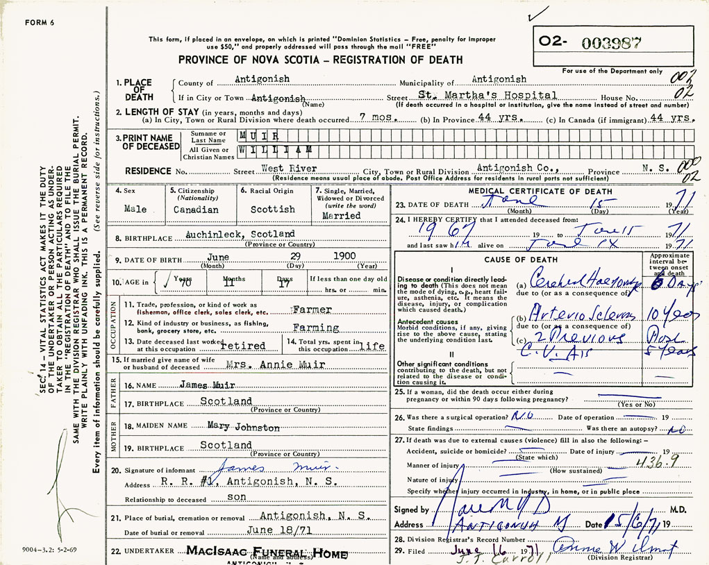 PROVINCE OF NOVA SCOTIA — REGISTRATION OF DEATH