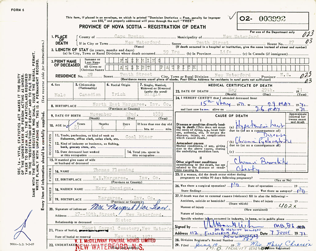 1. PLACE OF DEATH County of Cape Breton If in City or Town New Waterford